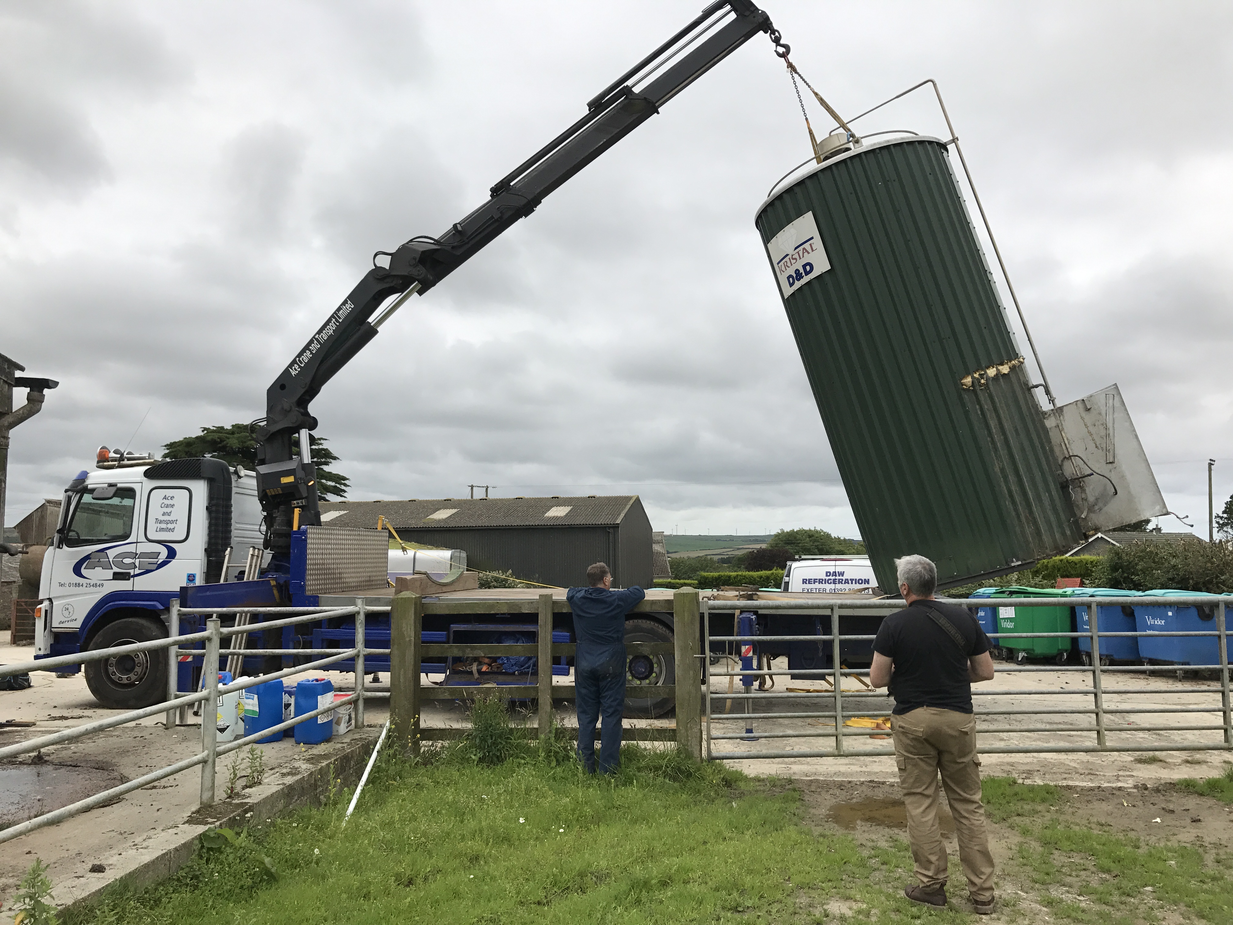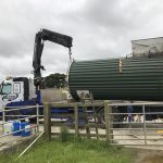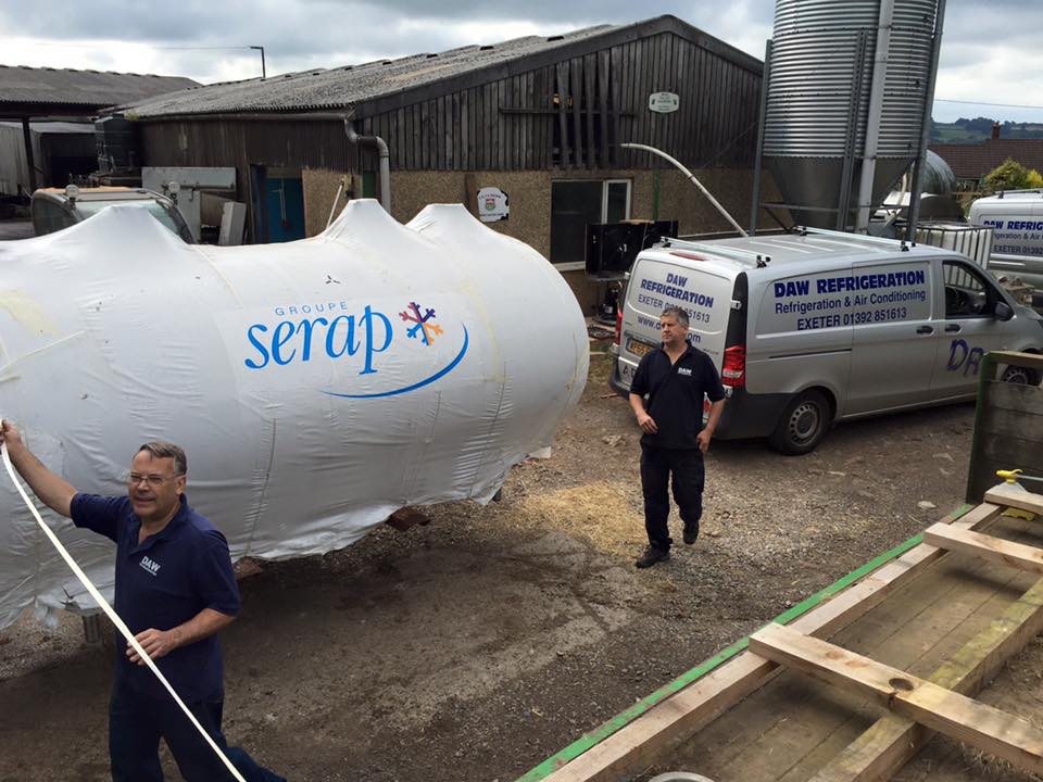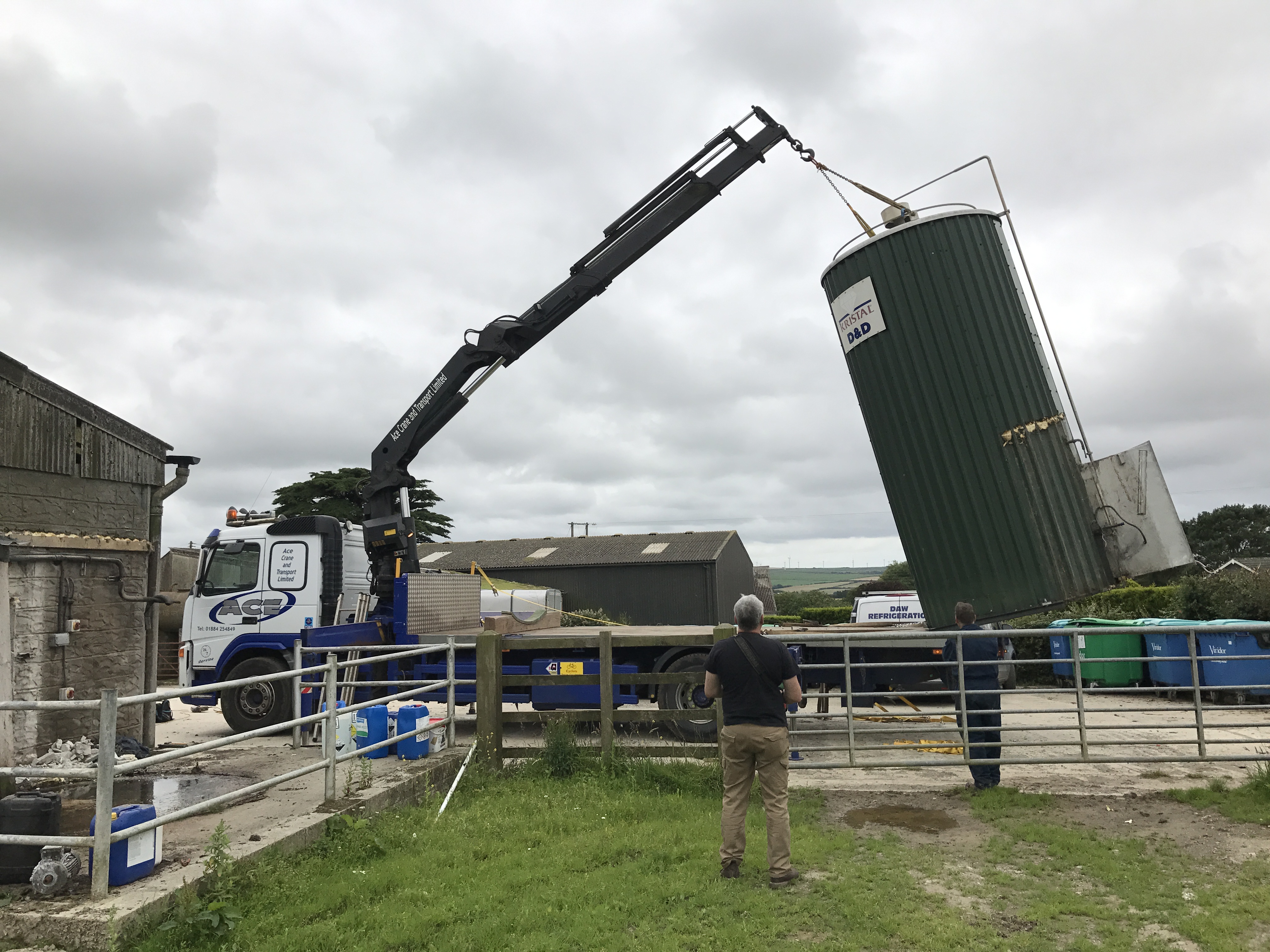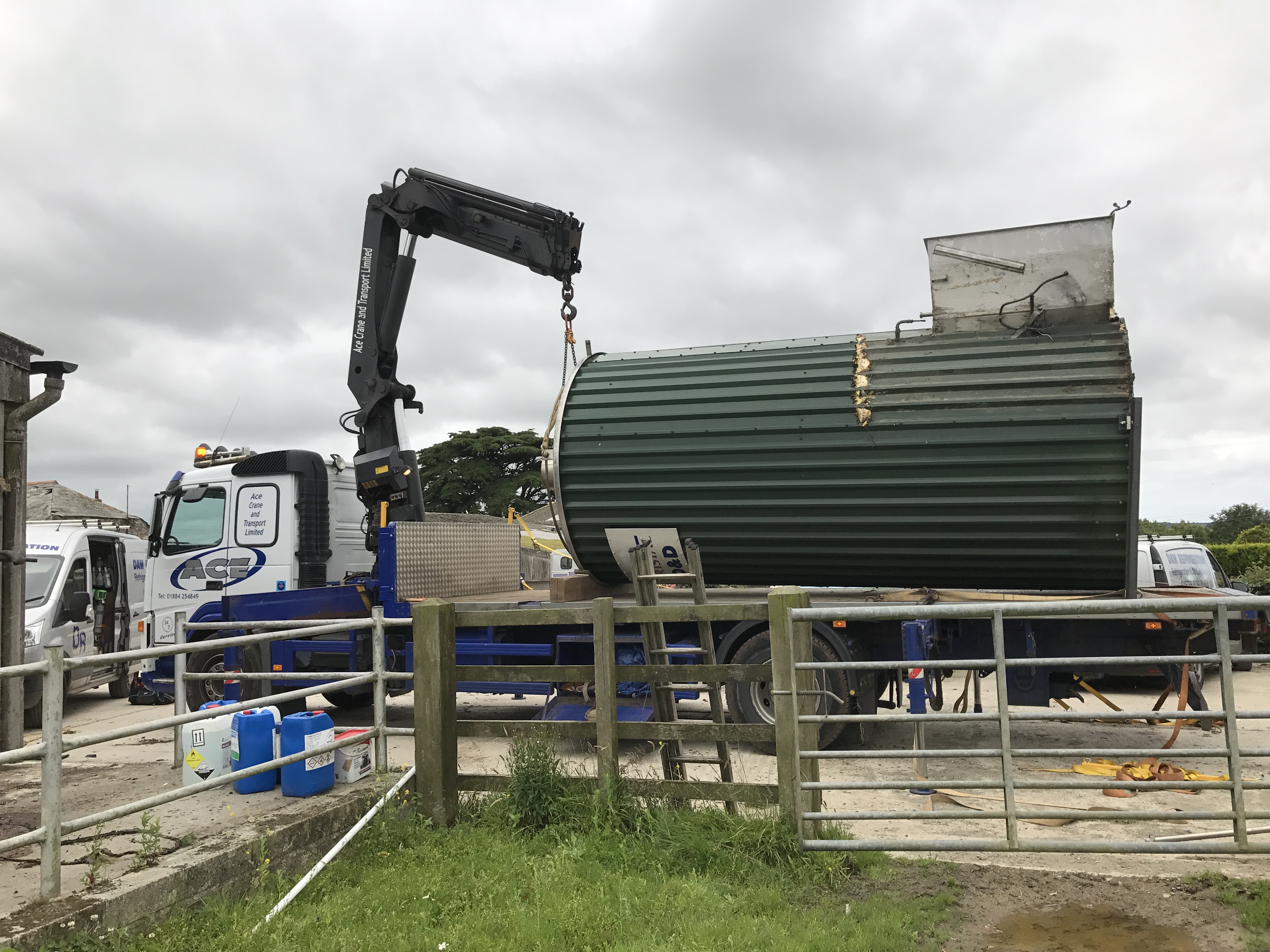 Removing a secondhand milk silo ready for installation at a new site. All transport and removal handled by Daw Refrigeration. The second hand milk tank will be fully installed at its new location along with a 2.5 tonne ice bank. The larger milk silo is to replace two smaller milk tanks.